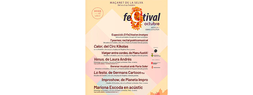 Du 10 au 19 octobre, Maçanet de la Selva accueille la 6ème édition du FeÇtival Octubre, une véritable fête des arts mêlant musique, poésie, cirque et humour. Parmi les temps forts figurent l’univers clownesque de Calor du Circ Kikolas, le piano intimiste de Laura Andrés avec Venus, ou encore le concert acoustique de Mariona Escoda, voix montante de la scène catalane. Le programme propose aussi des spectacles gratuits et familiaux, comme La festa des Germans Cartoon, un goûter musical avec Maria Soler, ainsi qu’un spectacle d’improvisation signé Planeta Impro, qui se produit pour la première fois à Maçanet. Accessible à tous, le festival fait rayonner la culture catalane dans une ambiance automnale et conviviale.