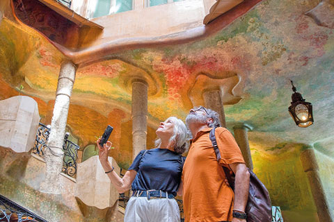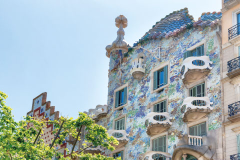 Le premier, l’agent de change et industriel Manuel Vicens i Montaner, commande à Gaudí sa résidence d’été, la Casa Vicens, dans l’ancien village de Gràcia (aujourd’hui Barcelona), après lui avoir fait dessiner des meubles pour sa maison d’Alella : de véritables petits bijoux, insolites par leur conception et leur décoration, à l’image de la fabuleuse armoire d’angle. Les services de l’urbanisme reçoivent alors des dessins à l’encre de Chine ou des aquarelles polychromes représentant des minarets, des décrochements, des décors en céramique colorée, des clochetons. Bref, une véritable œuvre graphique, hallucinante dans le contexte de l’époque et sans équivalent connu. L’architecture de la Casa Vicens est relativement simple, mais sa décoration demeure très sophistiquée, avec une utilisation très dense de la céramique d’inspiration orientaliste, associée au fer forgé, aux vitraux et à des éléments de marqueterie qui préfigurent la mise à l’honneur des arts décoratifs et appliqués. On sait que Gaudí a supervisé les travaux, assis sur un fauteuil tel un Fellini avant la lettre, orchestrant la chorégraphie du sculpteur Llorenç Matamala, de l’ébéniste Eudald Puntí ou du ferronnier Joan Oñós. L’ensemble s’organise sur trois façades et trois étages. Une alternance de ciment et de carreaux représentant des œillets jaunes crée une harmonie délicate, légèrement japonisante, tandis que des feuilles de palmier en fer ouvragé ornent la porte d’entrée. Gaudí est un maître du détail et le restera toute sa vie, veillant au confort, à l’hygiène et au bien-être de ses clients. Il adopte des claustras pour suggérer des espaces dedans-dehors, sublime le jardin par une fontaine, la nature demeurant sa principale source d’inspiration, comme l’illustre la présence d’une cascade encastrée dans une élégante rocaille, ornée de statues d’enfants à la baignade. Pour lui, la maison abrite « la petite nation de la famille » et, de fait, l’on pense un peu à la maison en pain d’épice de Hansel et Gretel, un rêve fait de pierre, de brique et de céramique, qui pose les fondements d’un langage novateur. Gaudí est prêt à déployer ses ailes, sans jamais oublier la dimension humaine. À côté des grandes commandes bourgeoises, Gaudí accepte aussi des chantiers plus modestes, comme celui du couvent et collège de Sainte-Thérèse, l’actuel Colegio Teresiano, quitte à reprendre des volumes laissés inachevés par un prédécesseur. Il conserve les fondations de Joan Pons i Trabal, mais compose un jeu de cours intérieures destiné à maîtriser la lumière. Malgré des moyens financiers réduits, Gaudí s’affranchit des canons de son temps pour livrer une œuvre d’une grande originalité : un château néogothique sobrement orné de symboles religieux, sans renoncer à ses arcs paraboliques caractéristiques. L’intérieur, conçu comme un château dans le château, austère et reclus, s’accorde parfaitement à la vie de l’ordre. C’est un art du peu avant la lettre, et une lecture lumineuse de la claustration, pensée comme une élévation verticale, d’une remarquable sobriété. Juste après, la Casa Calvet (1899) apparaît comme l’œuvre la plus conservatrice du maître, du moins en apparence. Construite pour l’industriel textile éponyme à des fins de logement et de commerce, elle inaugure le cycle des trois maisons que Gaudí érige dans l’Eixample, dans le respect du plan urbanistique d’Ildefons Cerdà. Cette relative sagesse, comparée à ses réalisations antérieures, lui vaut le prix de la maison de l’année décerné par la Ville de Barcelone, distinction qui restera sans suite. Édifié en grès de Montjuïc, l’immeuble, d’une sobriété maîtrisée, peut se lire comme un hommage au baroque et à la tradition catalane des arts du feu, céramique et fer forgé en tête. La maison dégage une exubérance contenue. Surmontée de deux frontons monumentaux couronnés de croix en fer, rythmée de balcons trilobés à l’encorbellement marqué, la façade affiche une solennité presque hiératique. Les statues des saints tutélaires, les bobines de fil évoquant la profession du commanditaire et la lettre C de Calvet, déclinée sur la porte et la tribune vitrée, composent un décor symbolique précis. Si un certain classicisme enveloppe l’ensemble, chaque détail en déjoue la rigidité pour affirmer une originalité discrète mais affirmée. Sans être l’œuvre la plus spectaculaire du cycle gaudinien, la Casa Calvet révèle une parfaite maîtrise des volumes et des chromatismes, tandis que sa décoration intérieure témoigne déjà d’une sensibilité de designer en avance sur son temps. Liberté et modernité s’expriment pleinement en 1904, lorsque Antoni Gaudí reçoit de Josep Batlló la commande de transformer une demeure existante, pratique courante à l’époque. Refusant une solution trop simple, l’architecte opte pour une métamorphose totale de la façade, une redistribution complète des volumes et un agrandissement spectaculaire du ciel ouvert, faisant de l’intérieur un univers lumineux et coloré, dominé par les courbes et les jeux de biseaux.