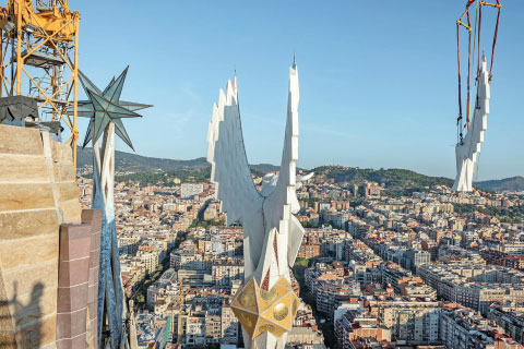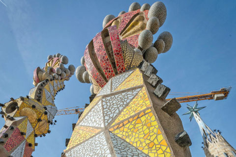 Près de la scène de la Trahison de Judas figure un carré magique d’ordre quatre, distinct de celui d’Albrecht Dürer : ici, la somme des chiffres, dans tous les sens de lecture, est de 33, âge du Christ à sa mort, et l’on compte 310 combinaisons possibles. L’idée dominante de cette façade puissante demeure la soumission à l’anéantissement, condition de la renaissance par la Résurrection. Une forêt de sculptures soutient ce foisonnement de pierre. Devant la Crucifixion, Josep Maria Subirachs s’inspire de Dante Alighieri pour poser la question : « Qu’est-ce que la vérité ? ». Ce n’est qu’en 2000 qu’a débuté la façade de la Gloire. Dédiée à la gloire céleste de Jésus, elle se déploie comme une ascension vers Dieu, évoquant la Mort, le Jugement dernier, la Gloire, mais aussi l’Enfer. « Le fragment de la maquette de la façade principale, je ne le terminerai pas et ne le compléterai pas. J’ai décidé de le laisser en chantier afin qu’une autre génération collabore au Temple, comme cela se voit dans l’histoire des cathédrales, aux façades conçues par des architectes et dans des styles différents. » Cette déclaration révèle chez Gaudí le sens des cycles, la conscience de la mort, pensée comme une autre vie, et un profond respect du travail des opératifs. Une étape décisive demeure inscrite à l’horizon de 2026, avec l’achèvement de la tour de Jésus-Christ, année du centenaire de la mort du Maître. Mais l’histoire, la guerre d’Espagne, la pandémie de Covid-19 et les contraintes financières – la Sagrada Família avançant sans le secours d’un financement public direct, portée presque exclusivement par la ferveur des visiteurs et des donateurs – ont différé l’accomplissement total de l’édifice. À l’image de la crypte de la Colònia Güell, inachevée mais complétée par l’imaginaire des visiteurs, la Sagrada Família est devenue le monument emblématique de Barcelone.